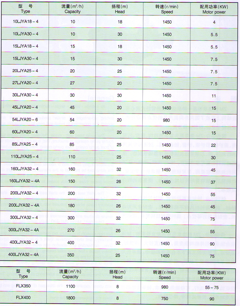 Model LJYA series slurry pump is a vertical centilever -type single - stage - single suction centrifugal submergedpump.Its blade wheel is a semi - open type ,In the front andback of the blade wheel instals an abrasio - resistant cov-er. The pump is widely used in chemical process for conveyingmedium containing less then 30% solid granules and with vis-cosity less than 200cp, which is subject to the interaction ofcorrosion and abrasion.It is especially suitable for conveyingsuch medium as phosphoric acid, triammonium phosphorateslurry, etc.In general, the teperature of the conveying mediumis less than 110C.When conveying medium with higher tem-perature, the bearing should be cooled with cooling wa-ter.Performance scope:flowQ= 10-400m3/h Lift H= 5- 50m