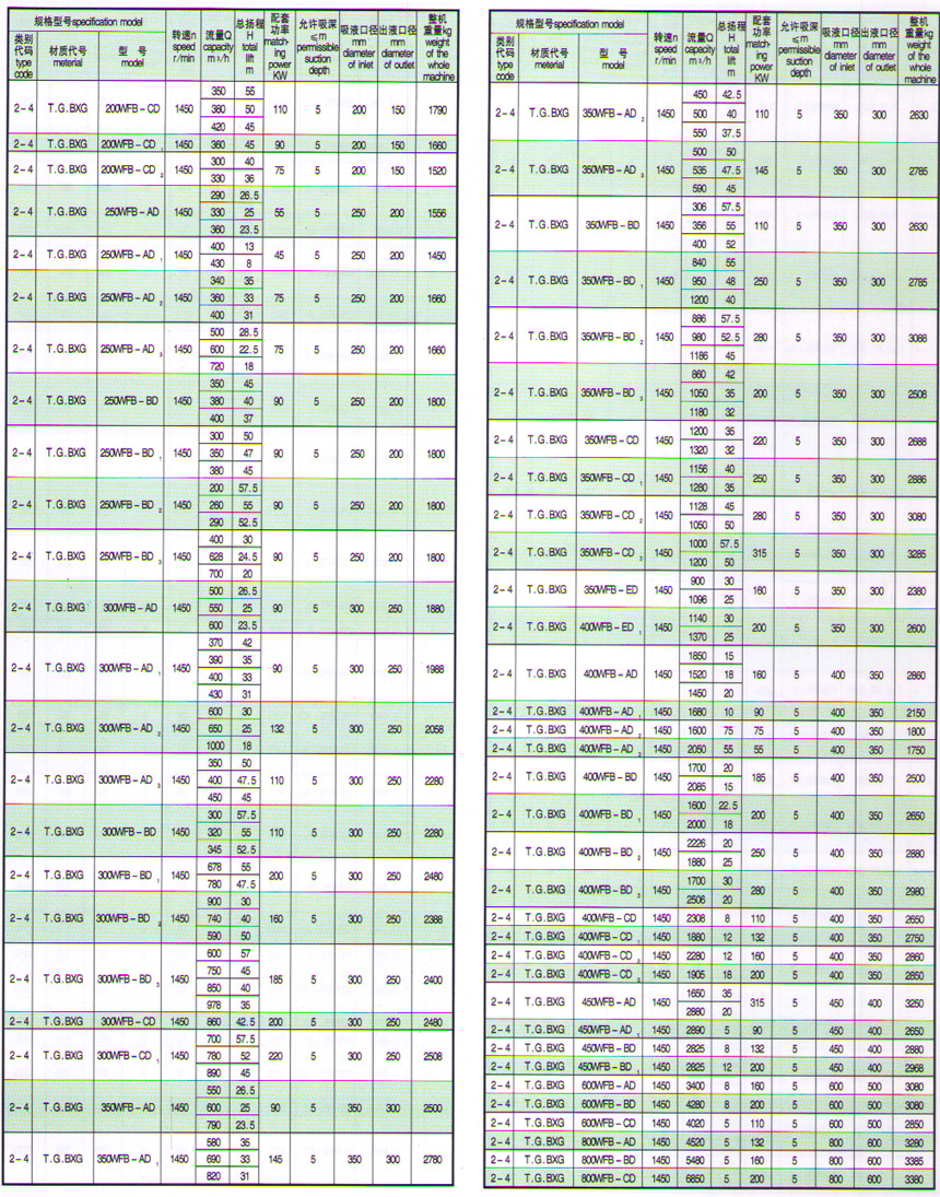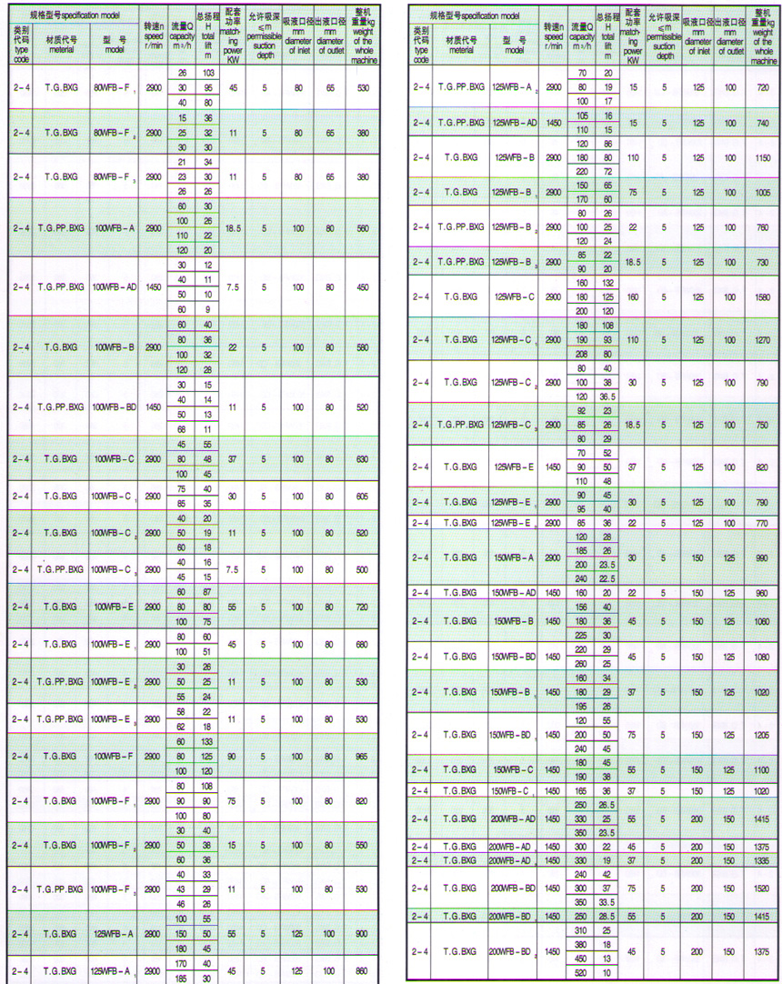 WFB型泵性能參數(shù)表 WFB Type pump Table of Performance